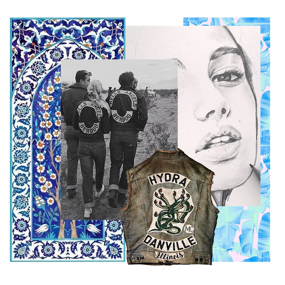 Started this illustration about a month ago but struggled to finish it. This is the concept mood board Icreated and direction I wanted to go with it. I wanted to mix the leather jacket 'Bad Girl' vibe with hippy vibe tiles pattern.